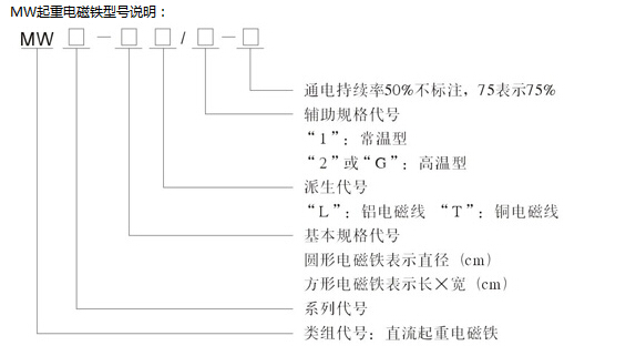 MW起重(zhòng)電磁鐵型号(hao)說明: